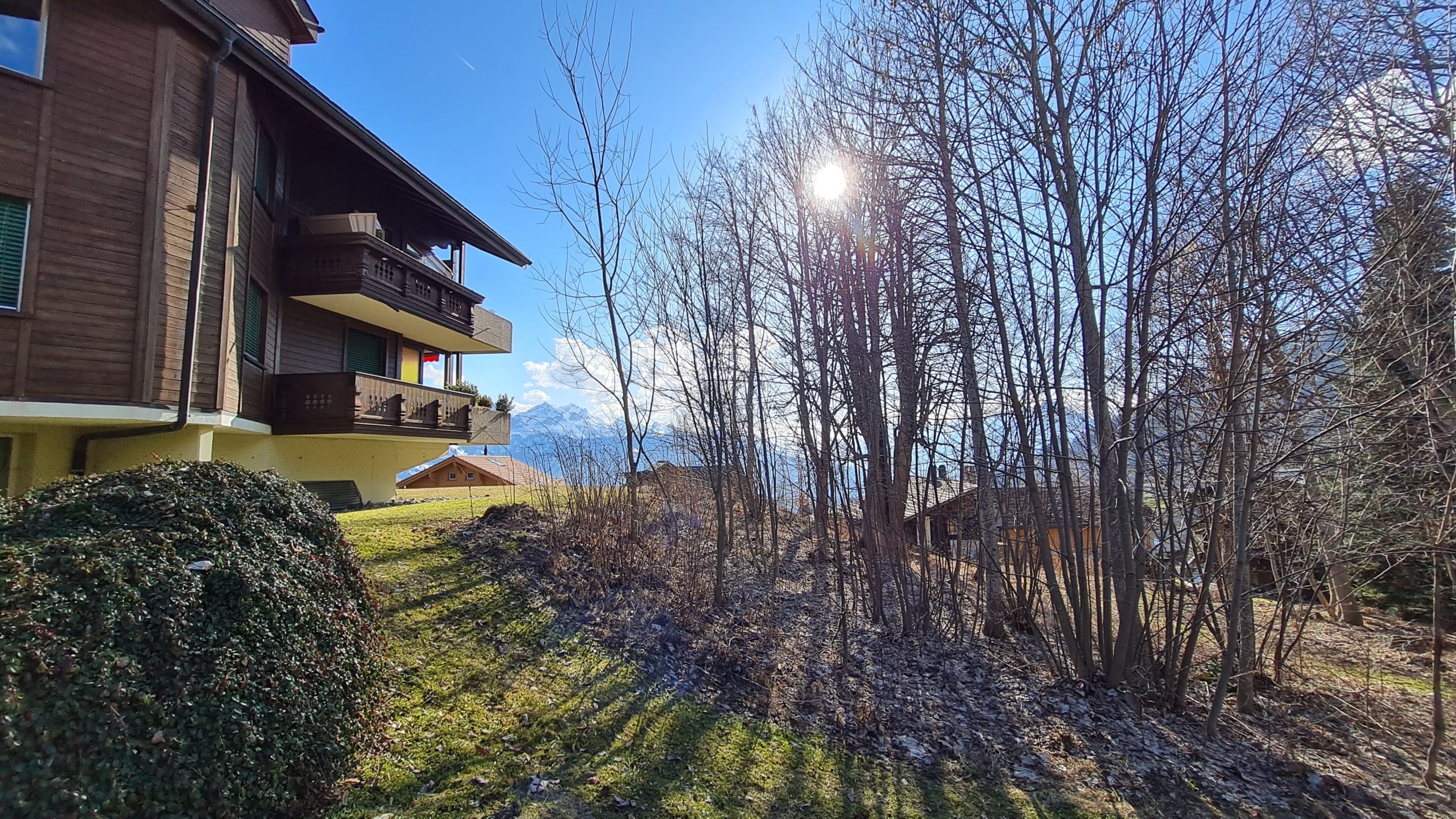 Das Mehrfamilienhaus steht an leichter Hanglage und geniesst uneingeschränkte Besonnung, absolute Ruhe und einen wunderschönen Panoramablick in die Berge und auf einen Ausschnitt vom Thunersee.