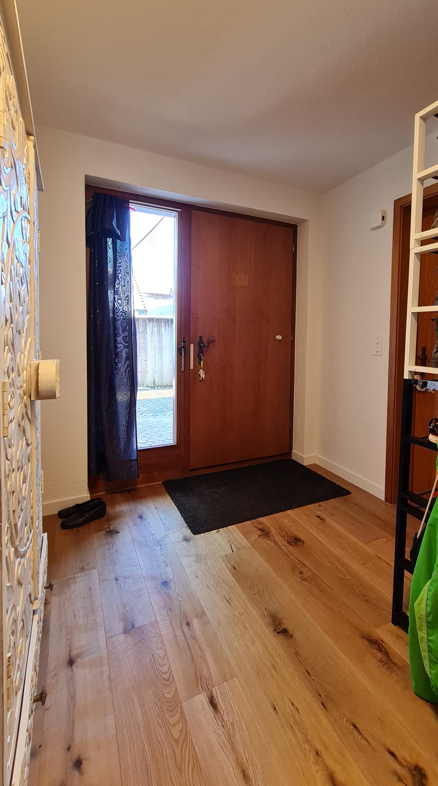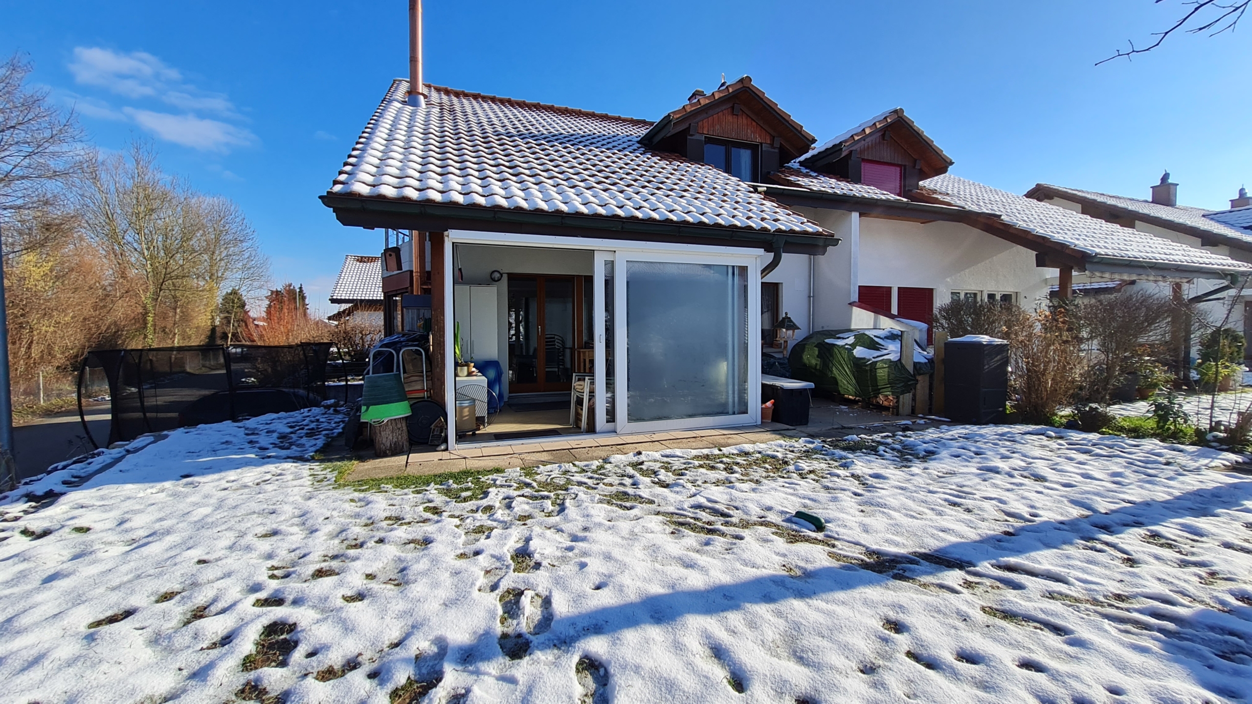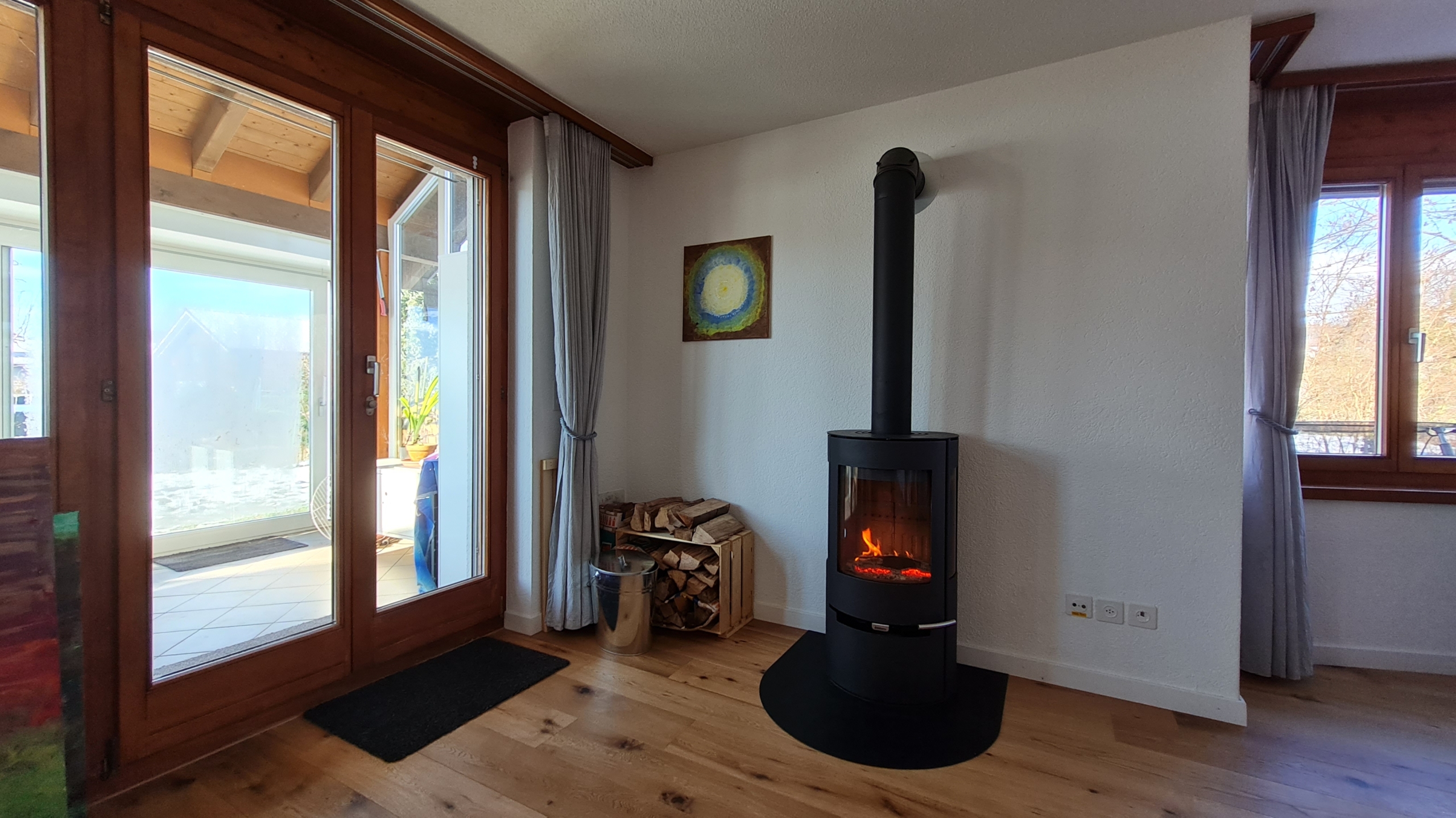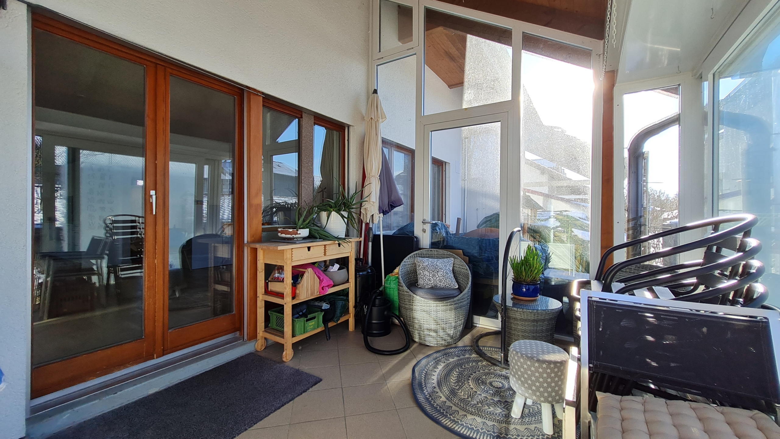 Ein wertvolles Detail ist das geräumige Entrée für die Garderobe. Im offenen Wohn- Essbereich mit der Küche sorgt ein Cheminéeofen für angenehme Wärme und der schöne, neue Echtholz Eichenparkettboden verbreitet ein gemütliches Ambiente. Ein Wintergarten lädt auch an kühlen Tagen zum Relaxen und Geniessen ein, ein Platz, den man nicht missen möchte.