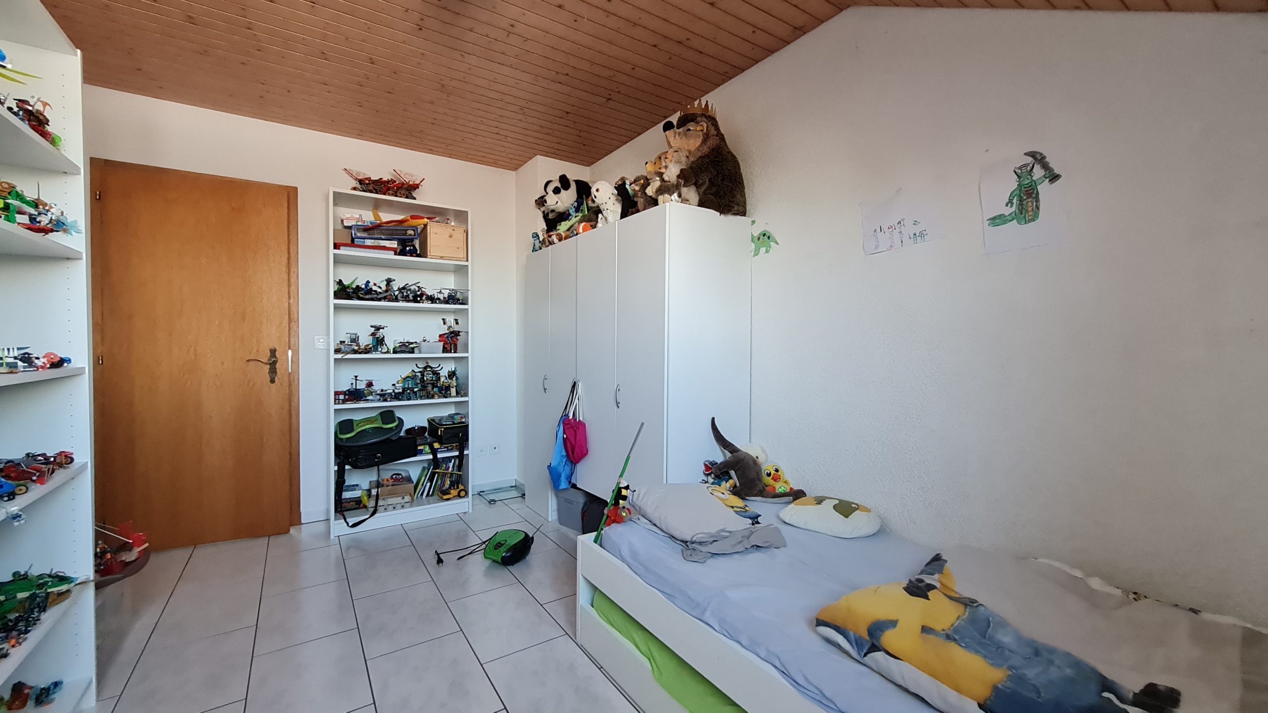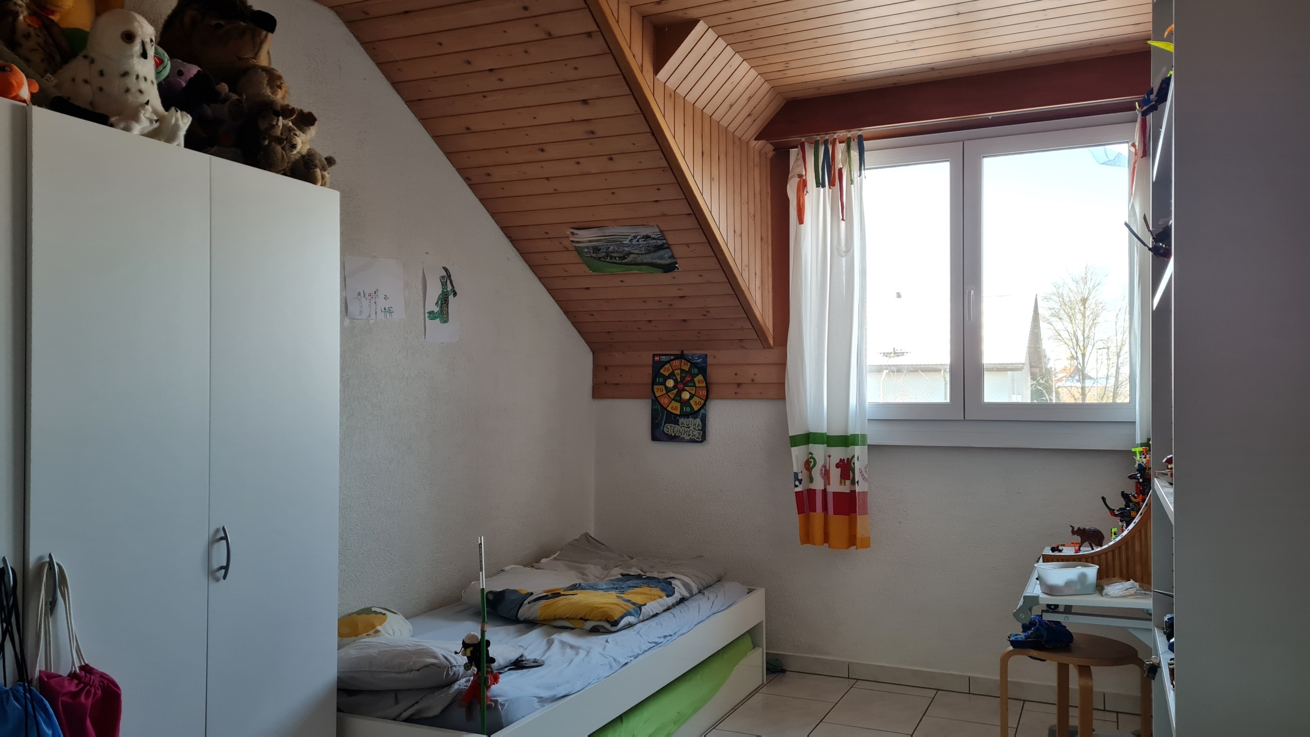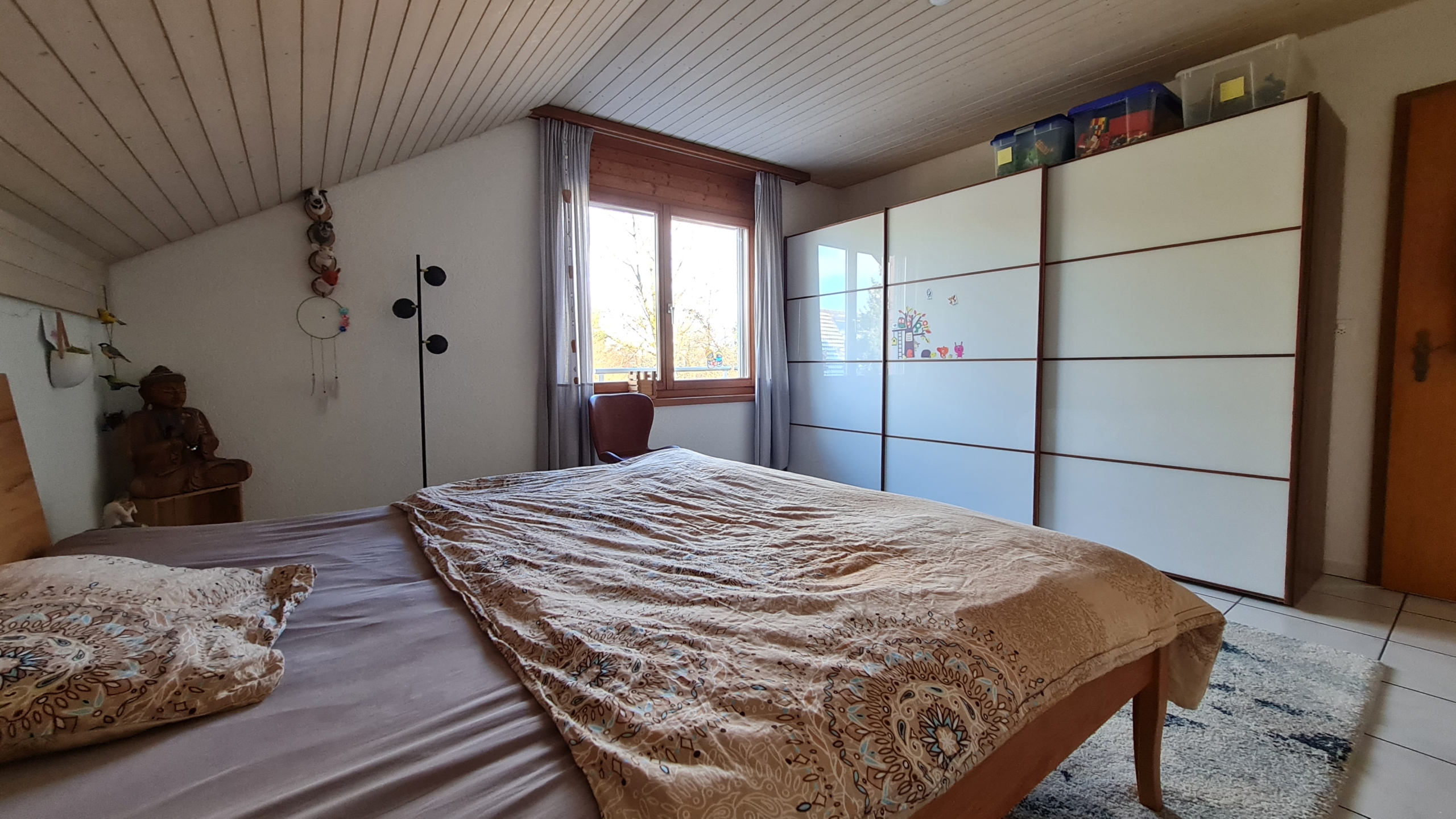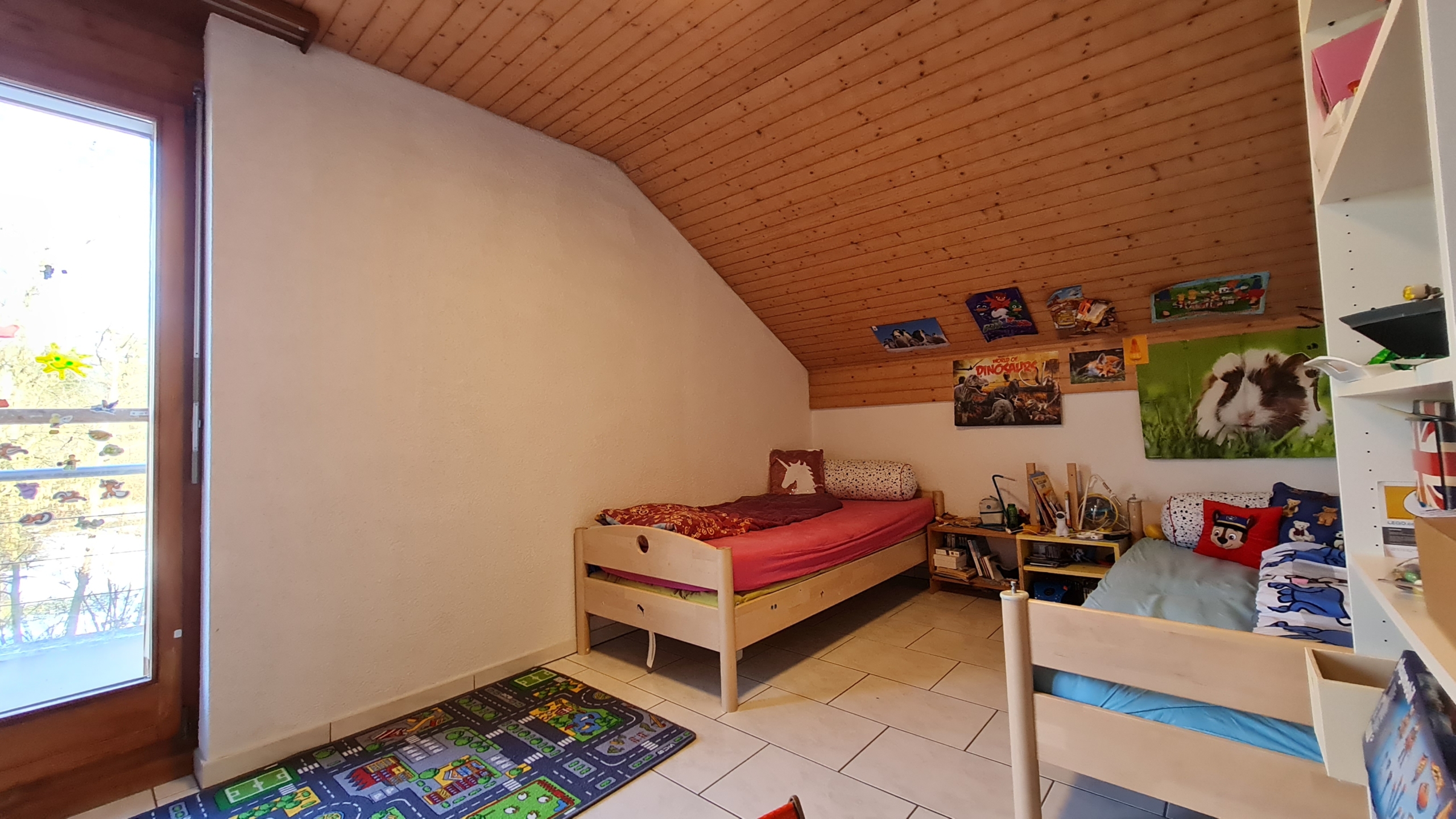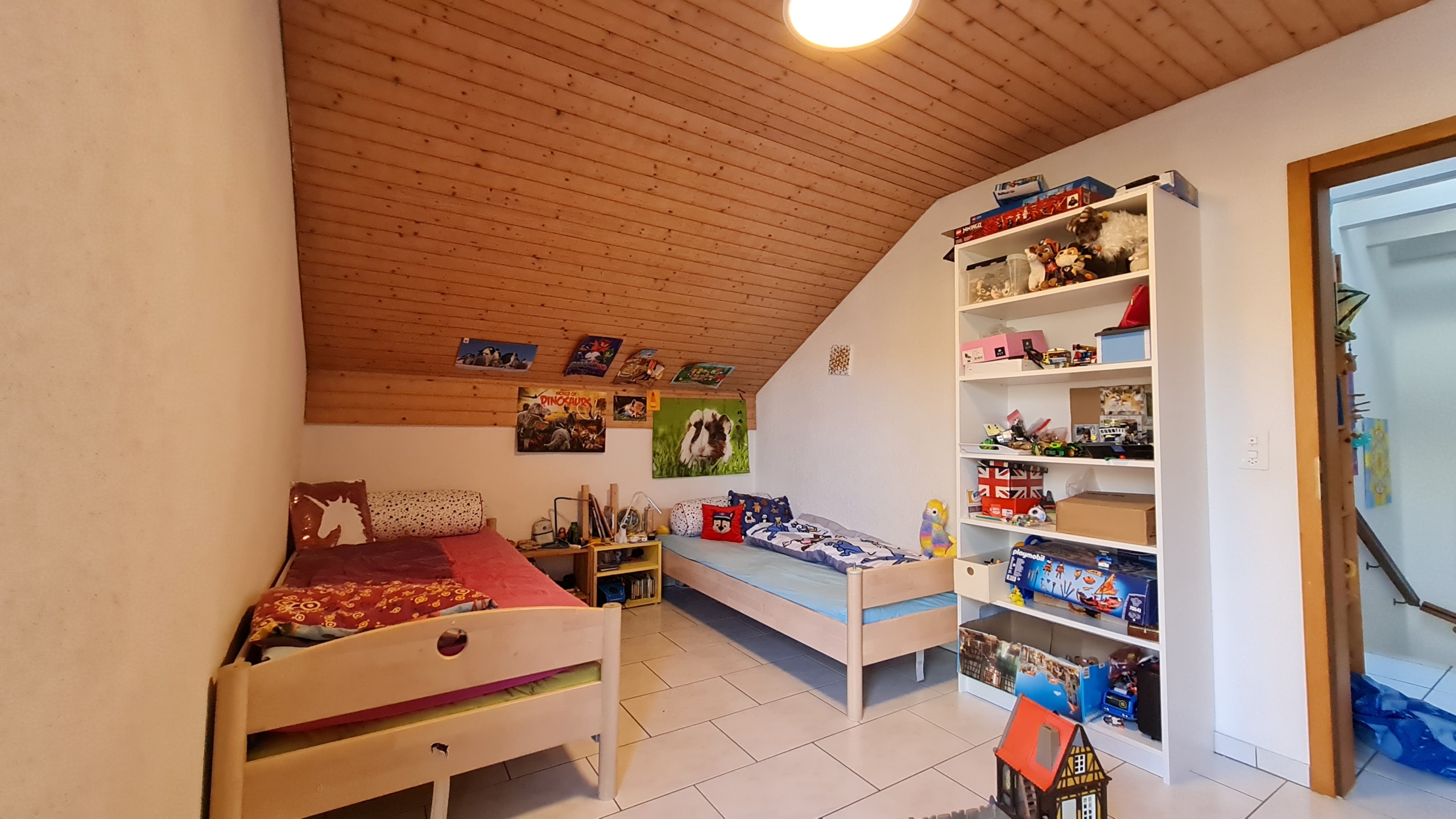 Im Obergeschoss liegen drei grosse Zimmer sowie das Bad mit Dusche und Badewanne.