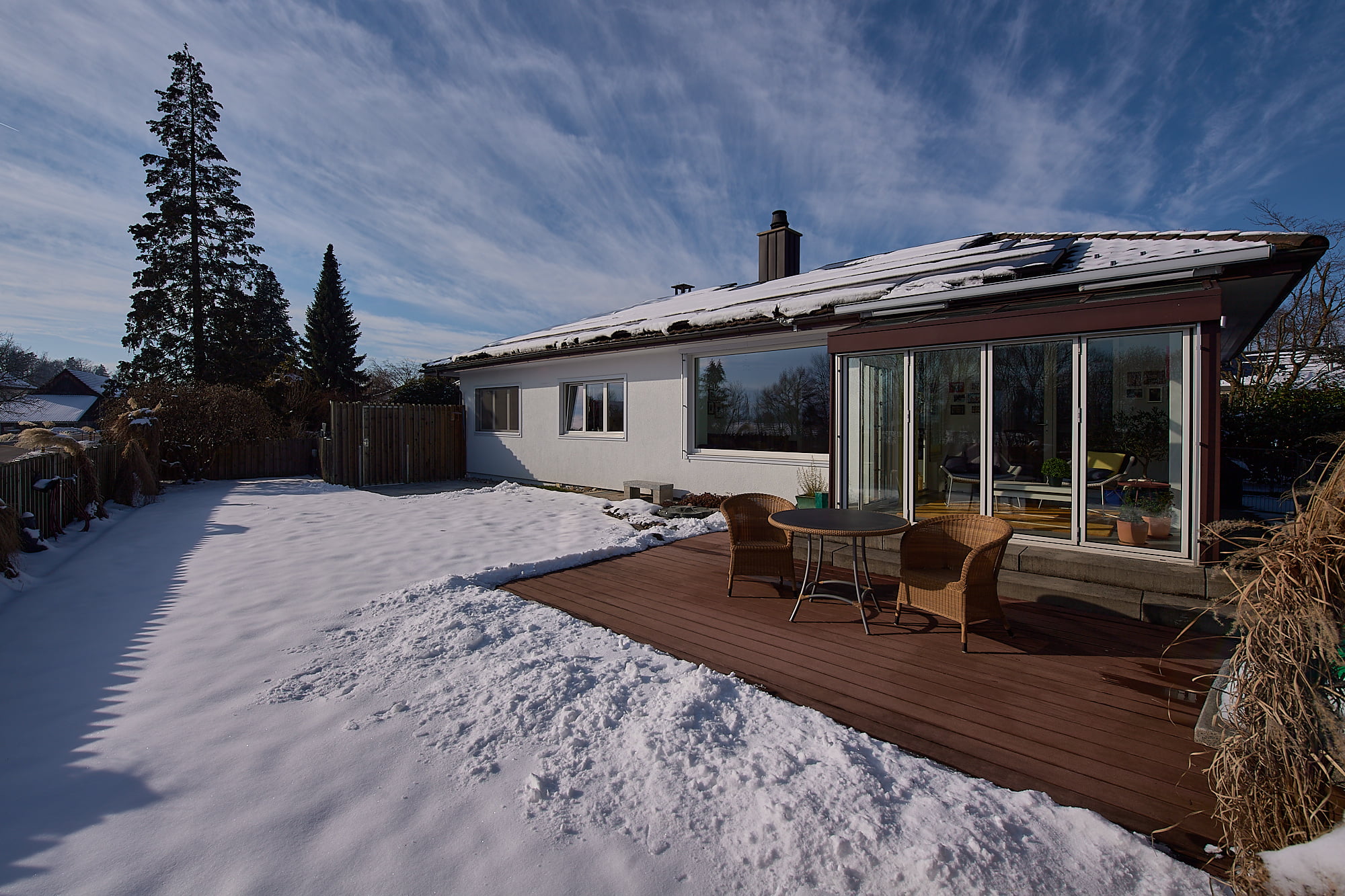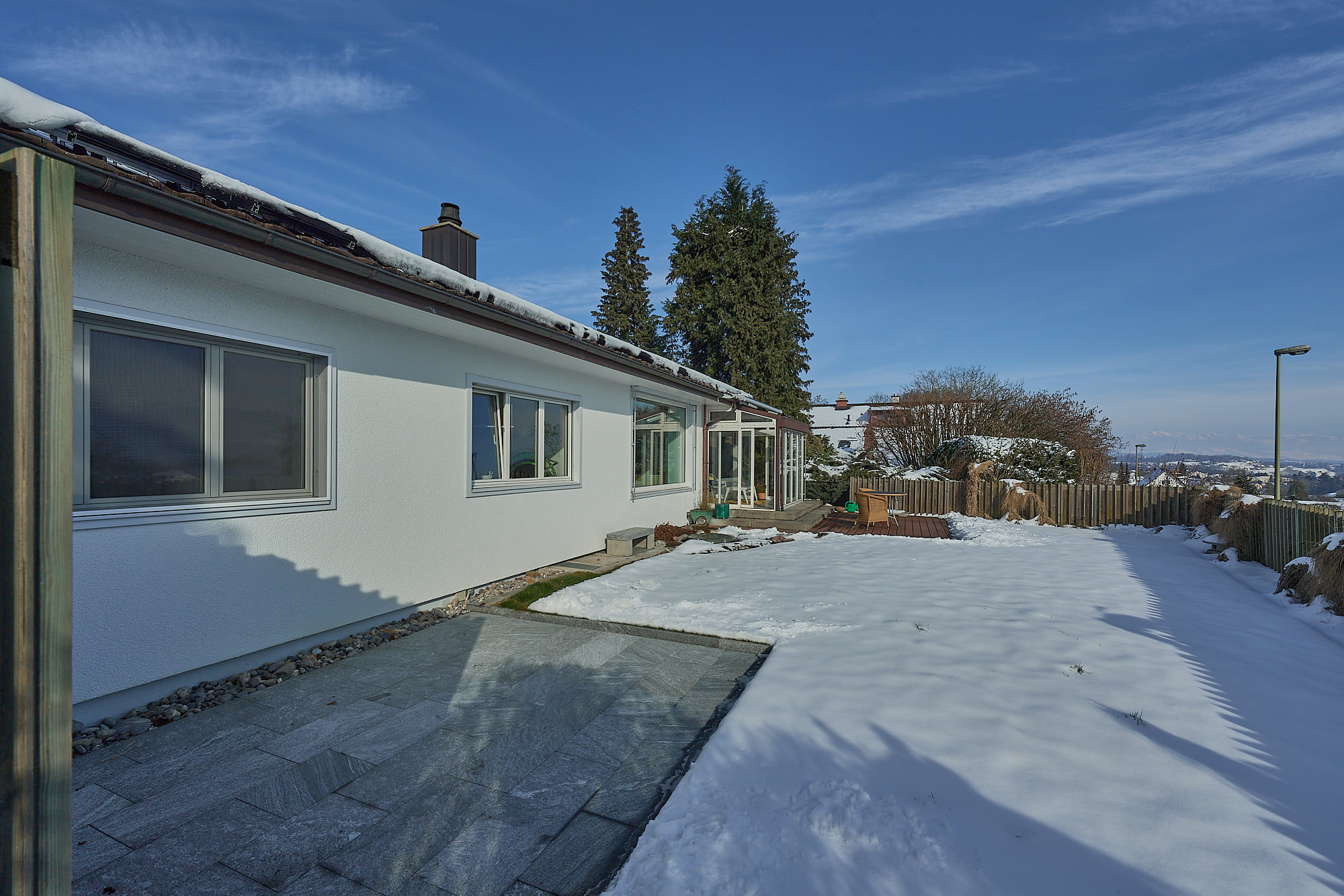 Ein Haus mit Wohlfühlcharakter, hell, grosszügig und mit schlichter Eleganz. Es ist ein Haus perfekt für Paare mit Anspruch auf hohe Wohnqualität mit geringer Umweltbelastung, sprich energieeffizient und ressourcenschonendes Wohnen. Dafür sorgt eine neu eingebaute Erdsondenheizung kombiniert mit einer Photovoltaikanlage. Weitere erwähnenswerte Merkmale sind diverse Einbauschränke sowie ein grosser Estrich der sich über die gesamte Wohnfläche erstreckt. Ein grosser Garten mit Privatsphäre und viel Gestaltungsfreiraum für Ideen und Gartenprojekte, die jedes Hobbygärtner-Herz höher schlagen lässt. Der beheizte Wintergarten – mit Bodenheizung – kann ganzjährig genutzt werden. Im Untergeschoss befindet sich nebst Waschküche/Keller/Werkstatt ein Gästezimmer mit Toilette.